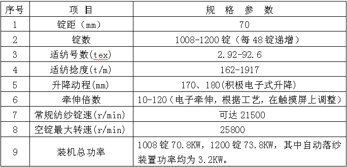 TH598J新一代集聚紡自動(dòng)落紗細(xì)紗機(jī)適用于棉、棉型化纖的純紡或混紡及≤51毫米化纖的純紡或混紡。該機(jī)適紡品種,原料范圍廣,既有利于配棉又可降低成本,可配置四羅拉負(fù)壓式集聚紡或卡摩紡、集體落紗(鋼帶式)、粗細(xì)聯(lián)、細(xì)絡(luò)聯(lián)、斷頭檢測(cè)等模塊化功能。其主要技術(shù)規(guī)格:(見(jiàn)表1)