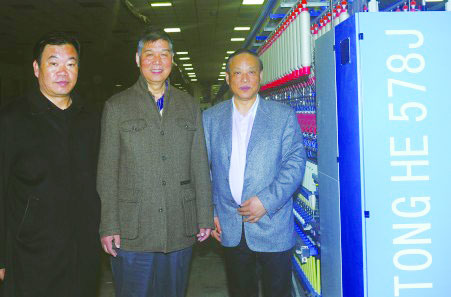 河南省舞鋼市銀龍紡織集團(tuán)董事長魯耀宏(左)、河南省紡織行業(yè)協(xié)會(huì)會(huì)長李書勤(中)、常州市同和紡織機(jī)械制造有限公司董事長崔桂生(右)在銀龍紡織車間同和公司生產(chǎn)的TH578J型集聚紡自動(dòng)落紗細(xì)紗機(jī)長車前合影。